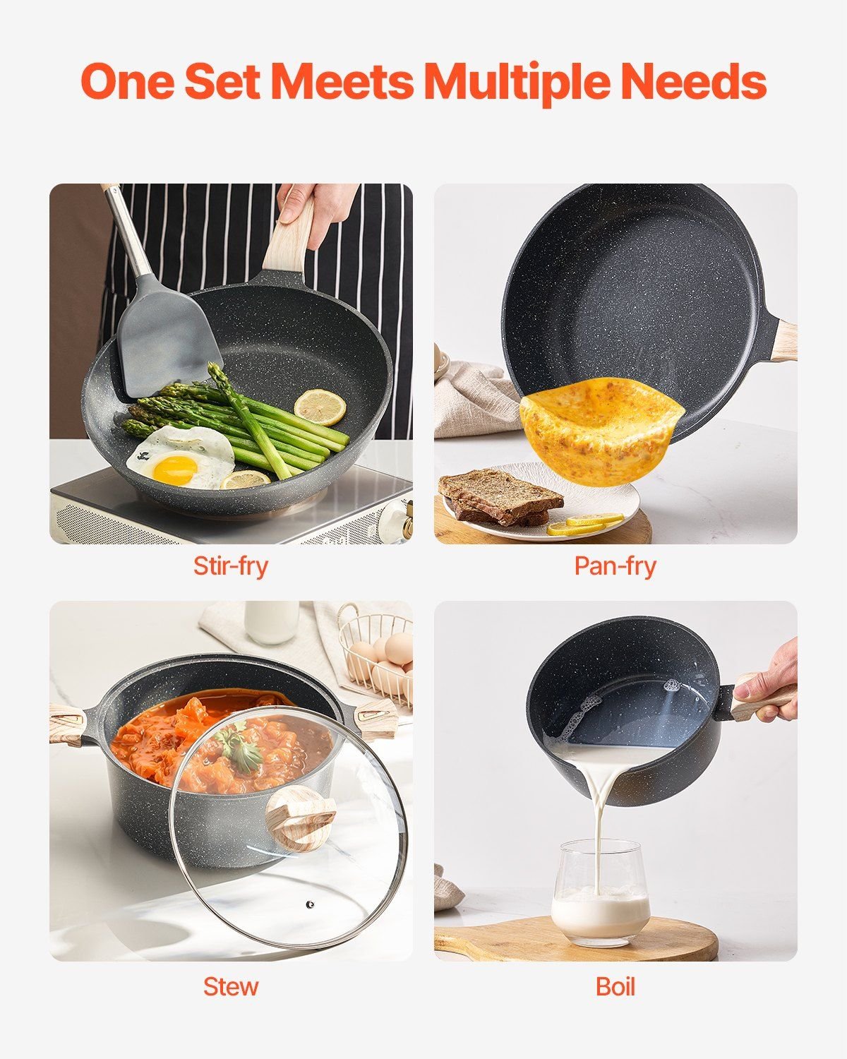 4.Multi-Purpose Cookware: Versatile and functional, this space saving pots set seamlessly transitions from stovetop to grill, and tabletop. Its elegant and modern design enhances the presentation of your dining experience