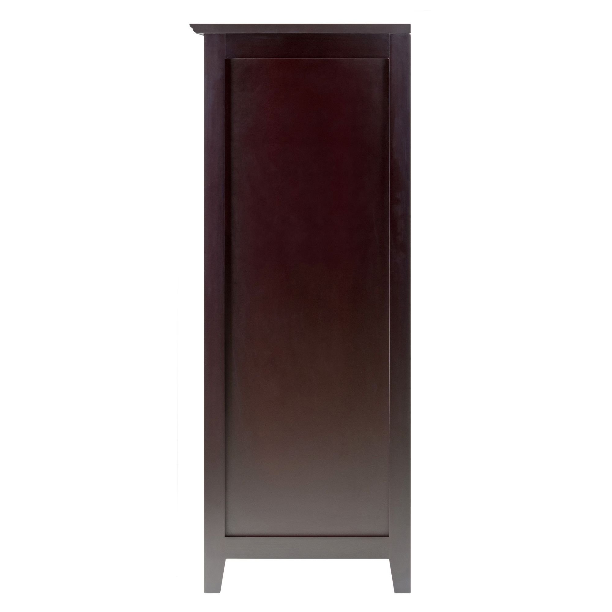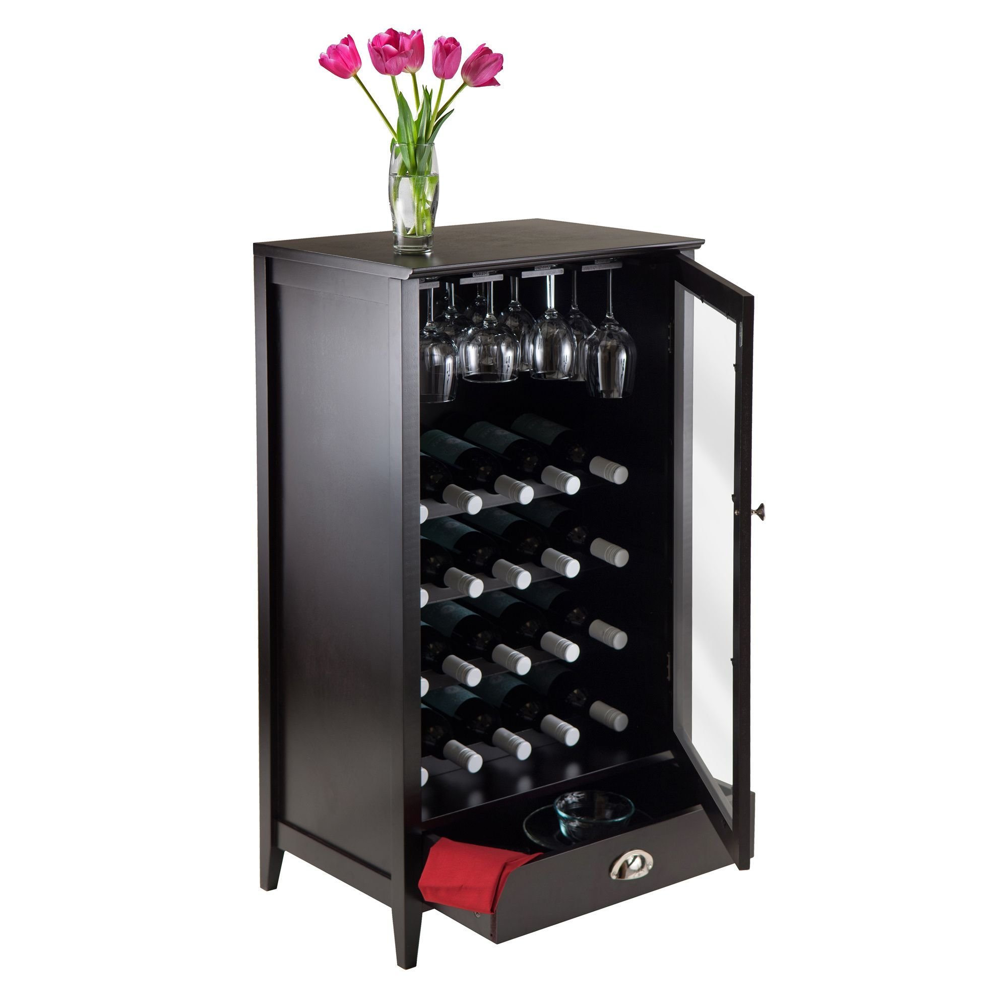 Bordeaux Modular Wine Cabinet 20-Bottle Shelf is a great addition to your home. The simple design has straight lines and a dark finish. Perfect storage piece for the wine enthusiast. The cabinet provides spacious single drawer for your accessories; stemware rack and four shelves for your wine bottles. Create a wine storage system with additional units and sit side by side. The glass rack has four sliding slots for storage up to 16-20 glasses. Total of four shelves will store 20 bottles of wine. Clear Glass Door with dark wood frame. Overall assembled size is 22"W x 16"D x 40"H. Cabinet is made with combination of solid and composite wood in espresso finish. Assembly Required.Glass rack can storage up to 16-20 glasses. Total of four shelves will store 20 bottles of wine.Overall size 22"W x 16"D x 40"H. Create a wine storage system with additional units modular.Cabinet is made with combination of solid and composite wood in espresso finish. Assembly Required.nullnullnull This product meets the oversized requirement per UPS/FedEx. The shipping weight reflected is the dimensional weight. This product also meets the large package requirement per UPS/FedEx. The estimated shipping cost will include this fee. Large package is $70.00; applied when length plus girth [(2 x width) + (2 x height)] combined exceeds 130 inches. Additional Handling charge of $10.50 applied where a package's longest side exceeds 48 inches in length; the second longest side exceeds 30 inches in length; or total weight is greater than 70 lbs.This product meets the oversized requirement per UPS/FedEx. The shipping weight reflected is the dimensional weight. This product also meets the large package requirement per UPS/FedEx. The estimated shipping cost will include this fee. Large package is $70.00; applied when length plus girth [(2 x width) + (2 x height)] combined exceeds 130 inches. Additional Handling charge of $10.50 applied where a package's longest side exceeds 48 inches in length; the second longest side exceeds 30 inches in length; or total weight is greater than 70 lbs.