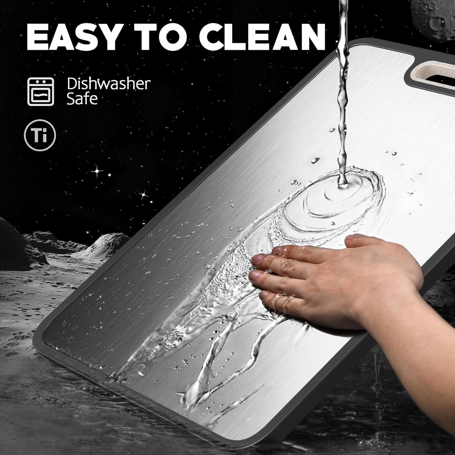 3.[Easy to Clean, DishwasherSafe]: This cutting board is easy to hand wash or machine wash. For best results, we recommend using a quick, gentle, or standard wash cycle. Both methods effectively remove residue while protecting the material and extending its lifespan. If machine washing, place the cutting board vertically or with the titanium side down for better cleaning results.