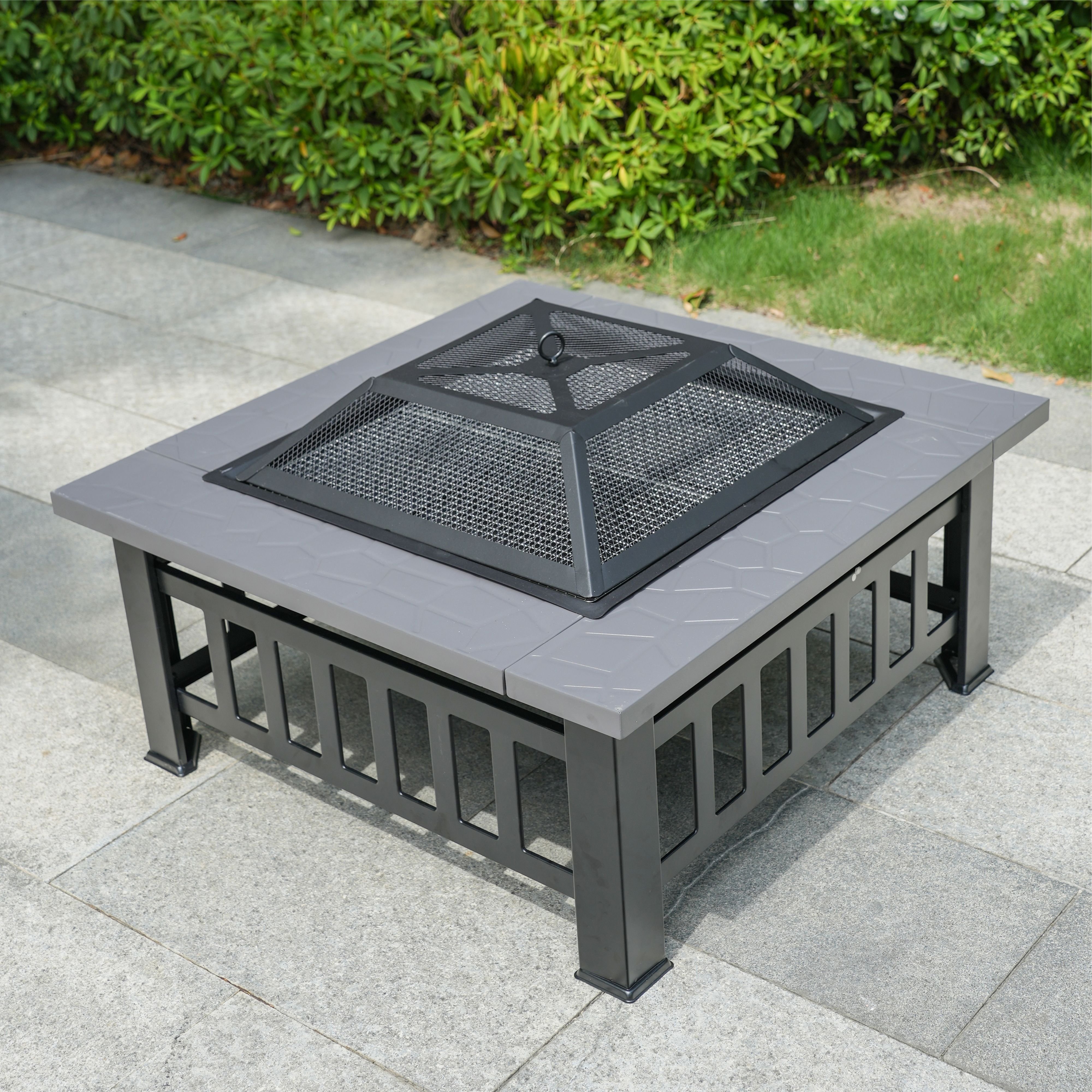 Experience the warmth and ambiance of a real wood-burning fire with this durable outdoor fire pit table. Measuring 31.90" x 31.90" x 14.96" and weighing just 12.5 lbs, this fire pit is perfect for your patio, garden, or camping trips. Constructed from powder-coated steel with high-temperature plastic coating and rust-resistant treatment, it is built to withstand the elements. The fire pit includes essential accessories such as a fire poker, wood rack, mesh cover, fabric cover, grill grate made of 201 stainless steel, and tongs, making it a versatile and complete outdoor heating solution.
